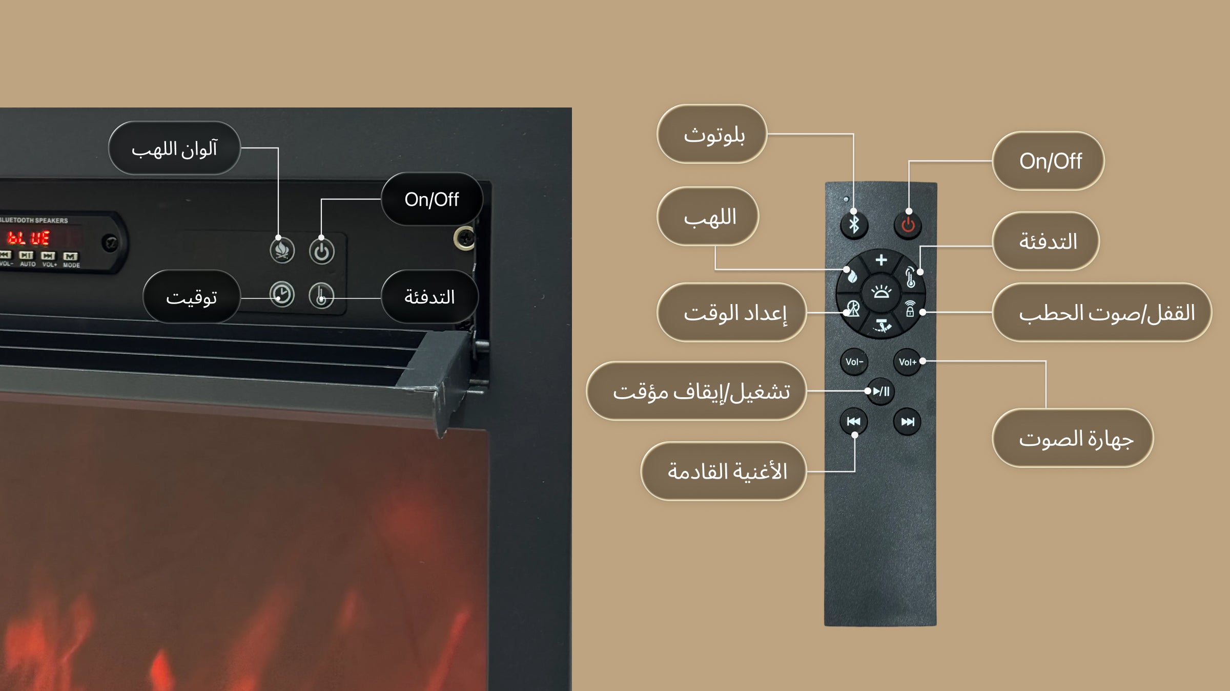 - يعمل تأثير اللهب ووظيفة التدفئة بشكل مستقل — يمكنك الاستمتاع باللهب فقط، أو التدفئة فقط، أو كليهما معًا.